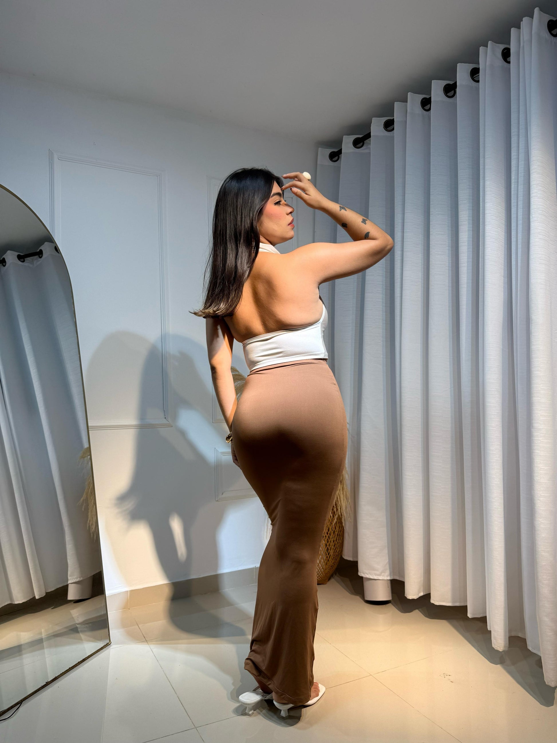 La falda Kendall en tono café es una pieza versátil y elegante que realza la silueta con su diseño ajustado y de tiro alto. Confeccionada en tela ligera y suave al tacto, se adapta perfectamente al cuerpo, brindando comodidad y estilo en cada movimiento. Su corte largo con caída recta estiliza la figura y la convierte en un básico atemporal para cualquier ocasión.